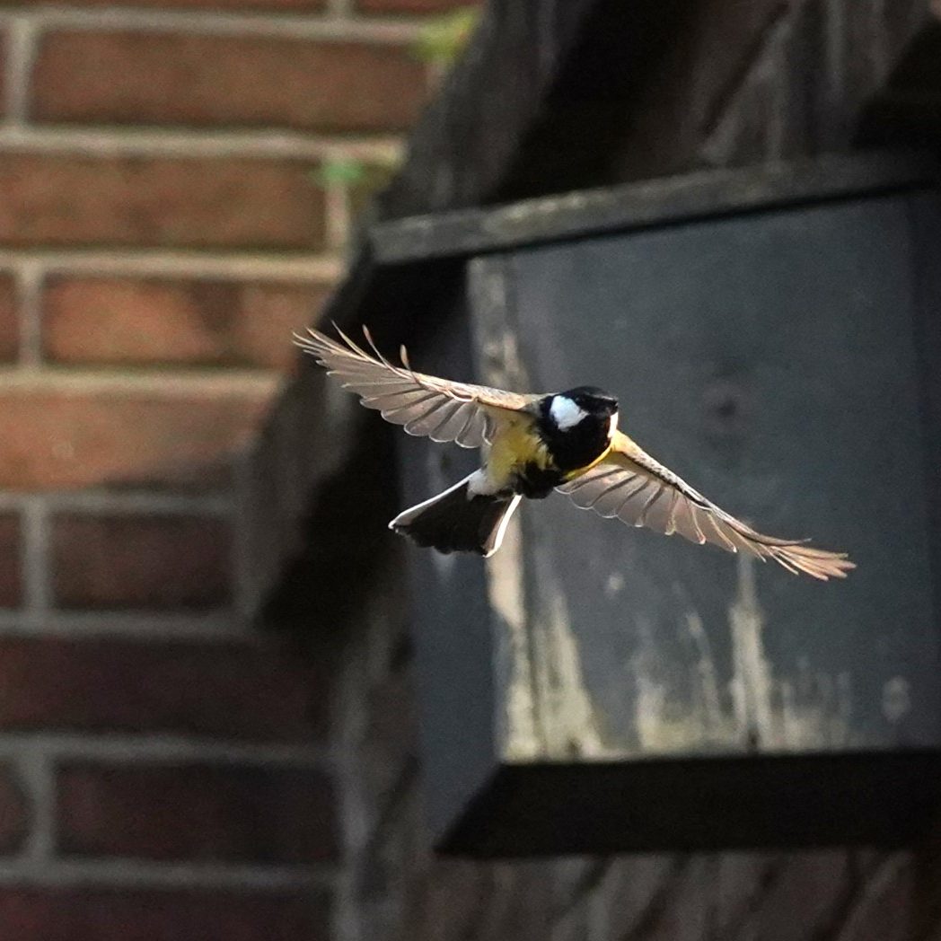 Veel foto's moeten maken om uiteindelijk de Koolmees in de vlucht te kunnen vastleggen.